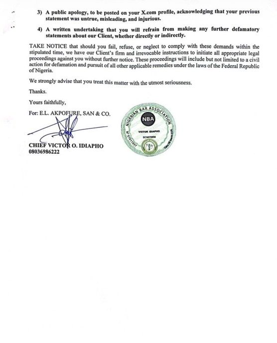 They further stated that the post constitutes actionable libel under Nigerian law and exposes the user to significant civil liability and potential criminal sanctions.