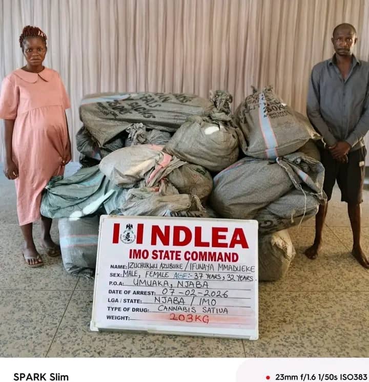 Elsewhere, a couple, Izuchukwu Azubuike, 37, and Ifunaya Mmadueke, 32, were arrested at Umuaka, Njaba Local Government Area of Imo State with 203 kilograms of skunk on Saturday, February 7.