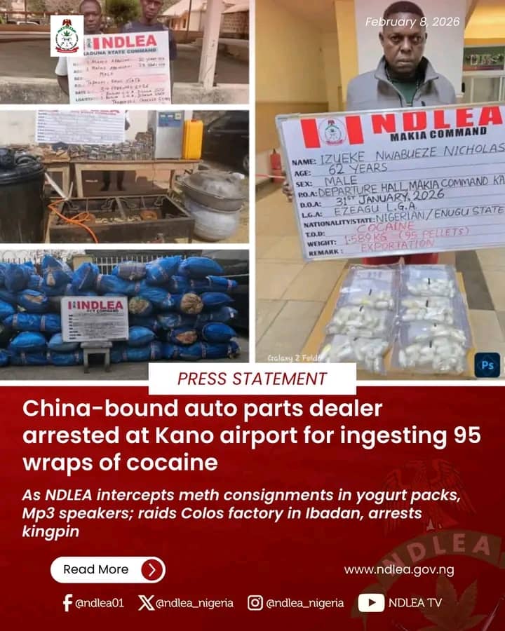 Operatives of the National Drug Law Enforcement Agency (NDLEA) have arrested a 62-year-old Lagos-based businessman, Nwabueze Nicholas Izueke, at the Mallam Aminu Kano International Airport (MAKIA), Kano, after he ingested 95 wraps of cocaine while attempting to travel to China.