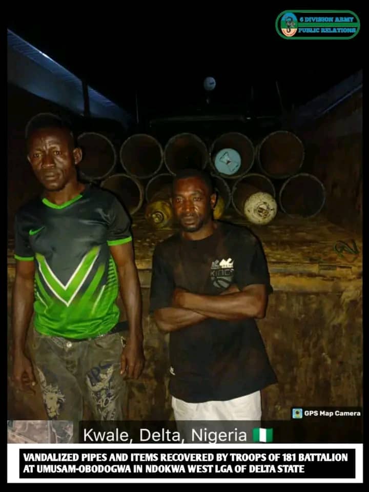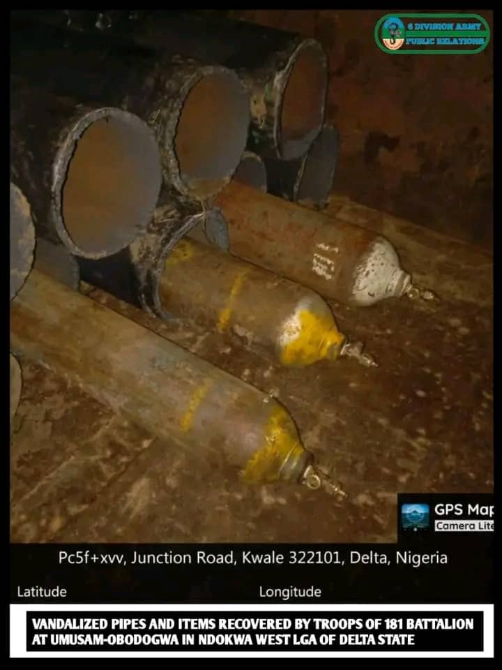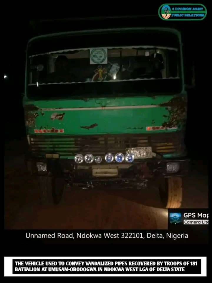 In another operation at Umusan-Obodogwa, Ndokwa West LGA, troops intercepted a Mercedes-Benz truck (registration number Enugu VE 174 ENU) loaded with 24 pieces of 14-inch pipes and three gas cylinders believed to have been vandalized from the SEPCO Oil and Gas pipeline in Kwale.
