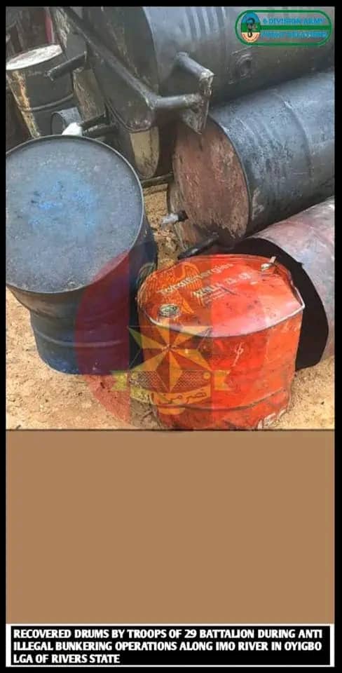 In Rivers State, troops raided multiple illegal refining clusters around Okolomade in Ahoada West LGA, dismantling three refining sites equipped with several large pots, receivers and coolants.