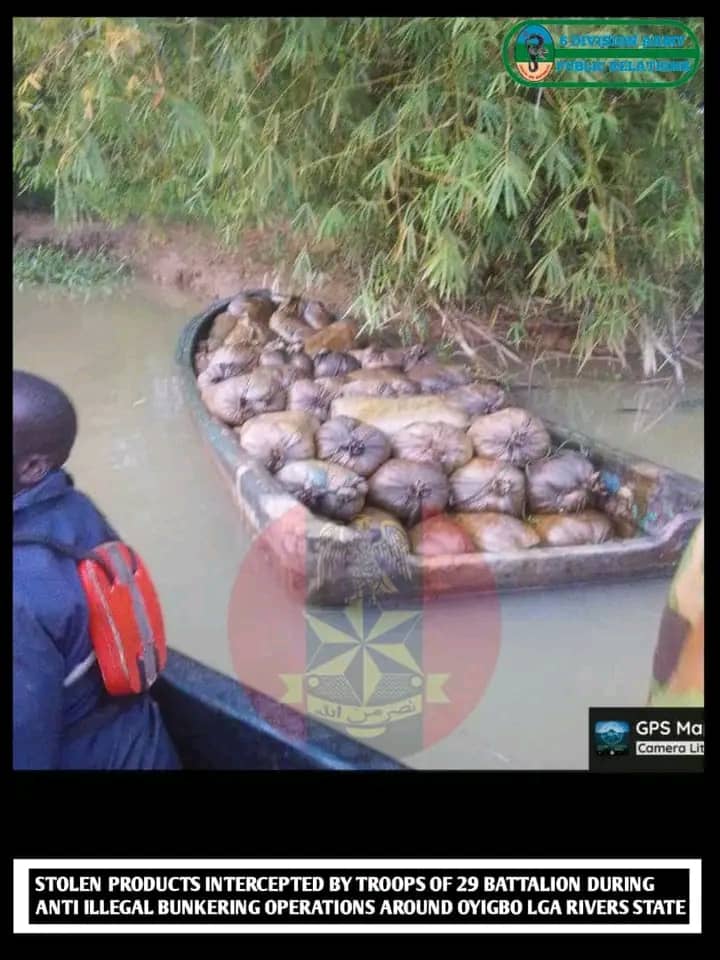 Acting on credible intelligence, troops also stormed a compound in Abuloma, Okrika LGA, where they discovered 1,050 sacks containing more than 32,000 litres of stolen crude oil.