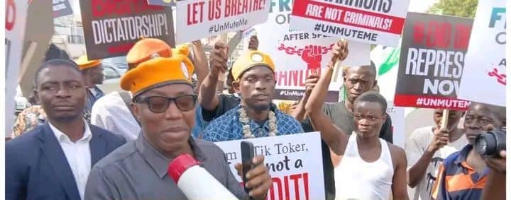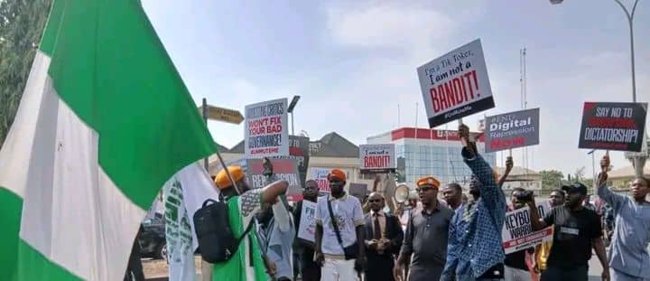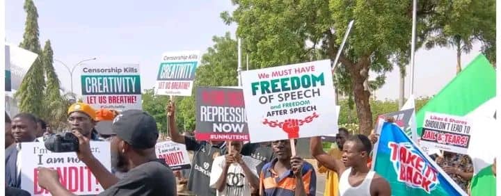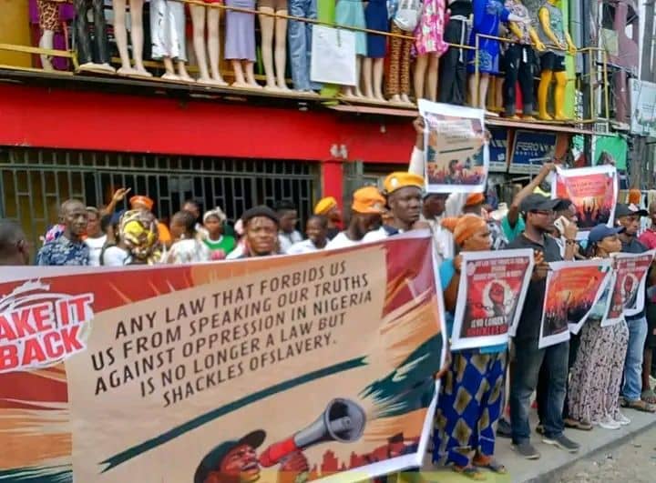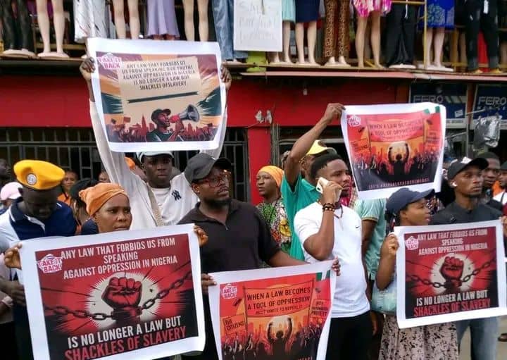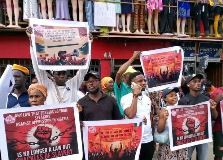 The demonstrators carried placards bearing inscriptions such as “Any law that forbids us from speaking against oppression in Nigeria is no longer a law but shackles of slavery” and “When law becomes a tool of oppression, unite to repeal it”