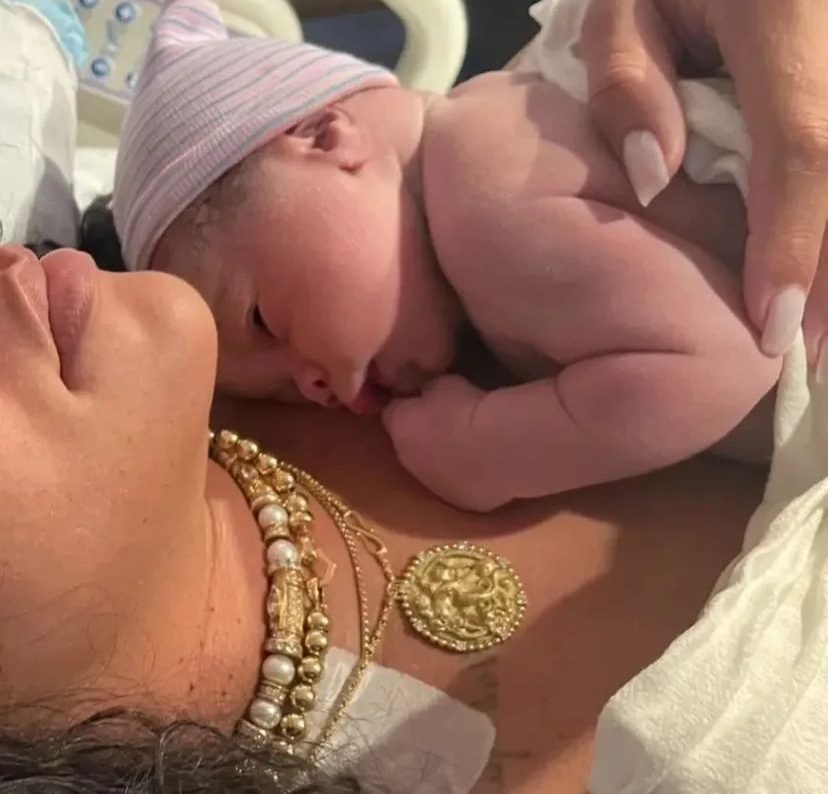 The image, which has since gone viral, shows the pop star lying in a hospital bed, skin-to-skin with her newborn. The baby, swaddled and wearing a striped cap, rests peacefully on her chest. Rihanna, adorned with gold and pearl jewelry, beams with maternal grace, offering fans a rare and intimate glimpse into her private life.