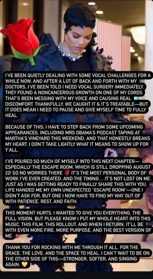 “It does mean I need to pause and give myself time to fully heal,” she wrote, describing the diagnosis as an unexpected “escape room” she now has to navigate with patience, rest, and faith.